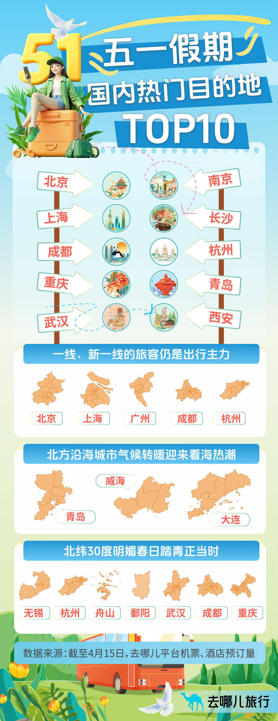 本年哪些出游场所地最热点?在去哪儿平台上,北京、上海、广州、成皆、杭州等一线、新一线城市的搭客仍是出行主力。从场所地来看,朔方沿海城市如青岛、威海、大连等因时事转暖迎来看海激越;北纬30度迎来明媚春日,江苏无锡,浙江杭州、舟山、绍兴,四川成皆,重庆等地皆将迎来赏春踏青的搭客。