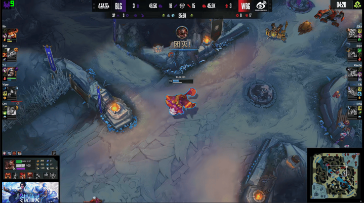 19分钟,Yxl妖姬残局补上要道输出,BLG击杀WBG上野随后拿下听牌龙