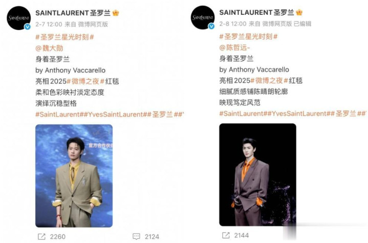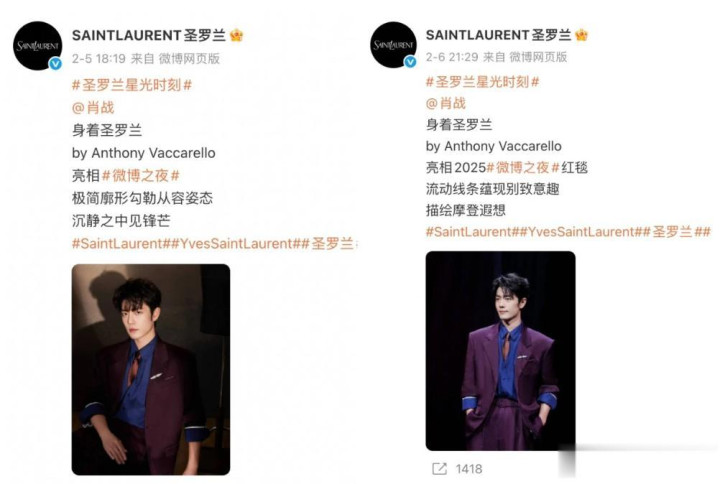 不外微博之夜适度后,YSL 官方微博 5 日今日就火速认领了肖战今日的穿搭照,致使贯串 2 天发了肖战的相片,露出肖战身为 YSL 护肤大家代言东说念主的地位。而魏大勋和陈哲远的相片则永诀在 7 日和 8 日才发布,网友因而簸弄 3 东说念主天然撞衫但不撞咖位,肖战顶流待遇依旧一骑绝尘。