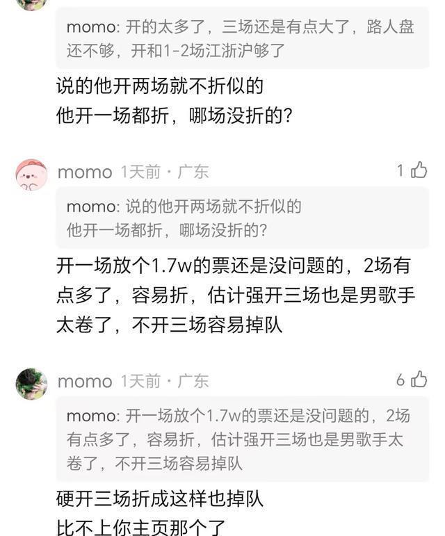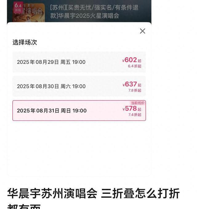直率讲,三连开的时候,粗略率主理方方面就还是知说念要打折了。 因为这个时辰点并不算尽头好,赶上了大大宗东说念主开学的时辰,好多的粉丝以及路东说念主粉,险些皆要去上学了。 大家也别不信,对比南京站演唱会,一样是三连开,南京站当今就不存在职何打折的情况,虽说溢价幅度不高,关联词总归是溢价了的。 聚积这两场的情况,咱们相比容易得出的一个论断是:华晨宇的粉丝,大大宗如实照旧学生。 南京站是节沐日历间,而苏州站刚好是开学本事,两者对比来看,照旧相比容易看出华晨宇的主要受众群体的。