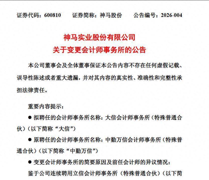 深圳商报读创客户端记者 舒桂林欧洲杯体育 神马实业股份有限公司(600810)1月9日晚间公告,拟聘用大信管帐师事务所(尽头肤浅结伴)为公司2025年度财务审计机构和里面适度审计机构,接替原推敲的中勤万信管帐师事务所(尽头肤浅结伴)。 神马股份这次变更管帐师事务所的决定,距其聘用中勤万信仅夙昔三个月。 笔据公告,神马股份原审计机构立信管帐师事务所已不时工作满10年。2025年8月28日,公司董事会及同庚10月10日鼓励大会审议通过,聘用中勤万信为2025年度审计机构。 可是,中勤万信近期因“2